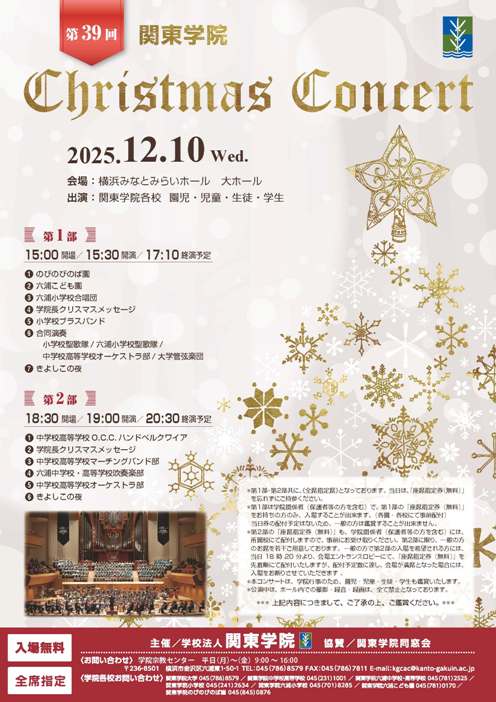 ※第1部・第2部でそれぞれ座席指定券が必要です。学院関係者は各校の事前配布でチケットを入手してください。第2部のみ一般の方の席が若干用意されますが、当日の先着順です。(ちらしをご覧ください)